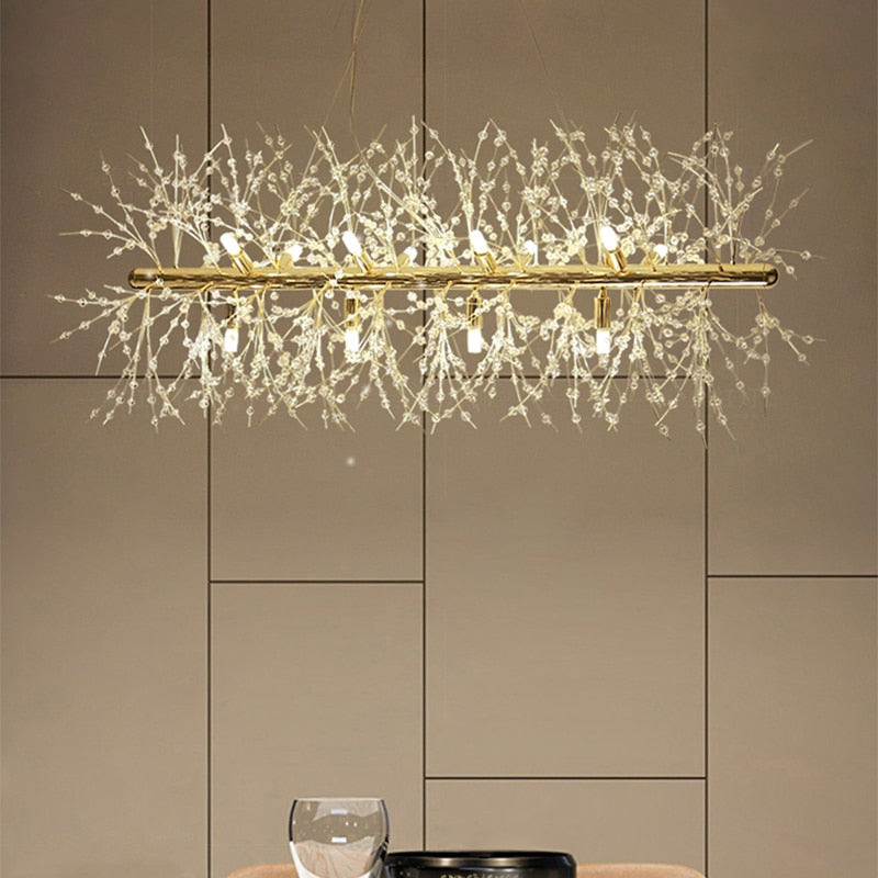 Suspension de luxe 'Lili' en métal et acrylique doré délivre une ambiance magique grâce à son éclairage blanc chaud. Ce luminaire, idéal pour le salon et la chambre, ajoute une touche glamour et intemporelle à votre intérieur avec ses 8 lumières diffusant une lumière chaleureuse. La conception polyvalente et les matériaux de haute qualité assurent une présence décorative durable et un confort visuel.